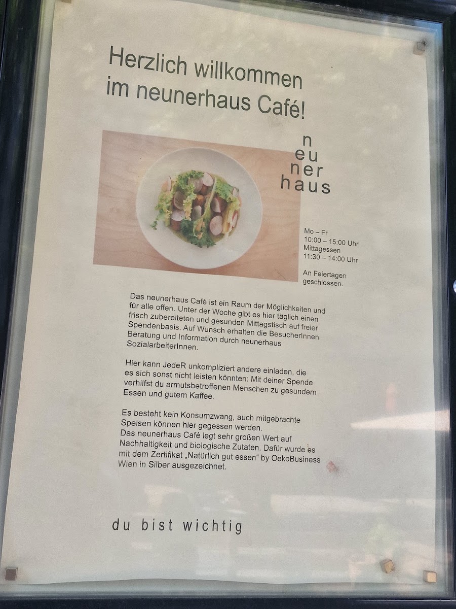 Welcome to neunerhaus Café, a unique gem located at Margaretenstraße 166, 1050 Wien, Austria. This café operates on a donation-based model, ensuring that everyone can enjoy its offerings. Here, you'll find a delightful selection of organic and vegetarian dishes, all crafted with care by an exceptional chef. The vibrant menu includes daily specials, like a heartwarming carrot soup that has received rave reviews.